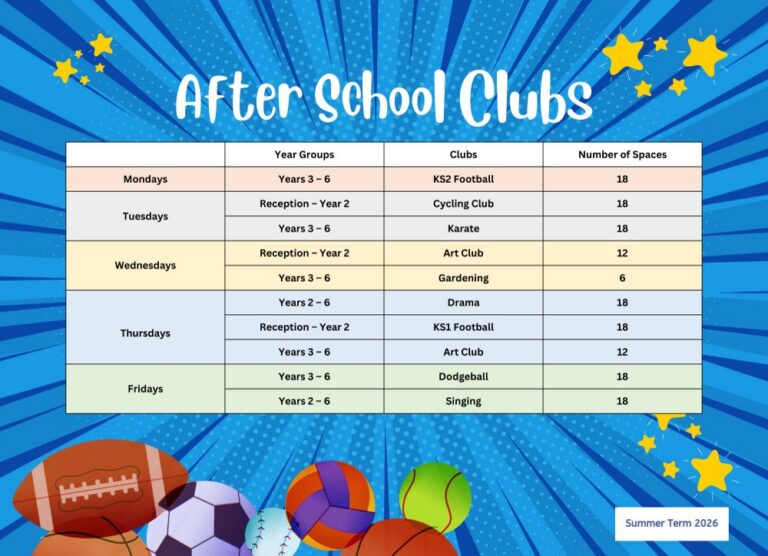 Pupils in Reception – year 6 can sign up to take part in a variety of after school clubs each term. We run a variety of clubs including; gardening, art, sports, music and drama. Most clubs run 3.30-4.30pm and cost a flat fee of £55 per term.